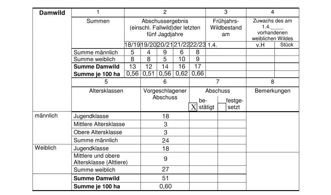 Nach der gesetzlichen Neuregelung im § 25 Absatz 1, Satz 4 im Niedersächsischen Jagdgesetz sind künftig je Jagdbezirk jährlich je Wildart zwei Stücke weibliches Wild oder männliche Kälber (Lämmer) ohne Abschussplan frei. Im begründeten Einzelfall kann die Freigabe von männlichen Stücken aus anderen Altersklassen beantragt werden.